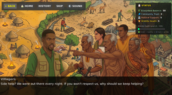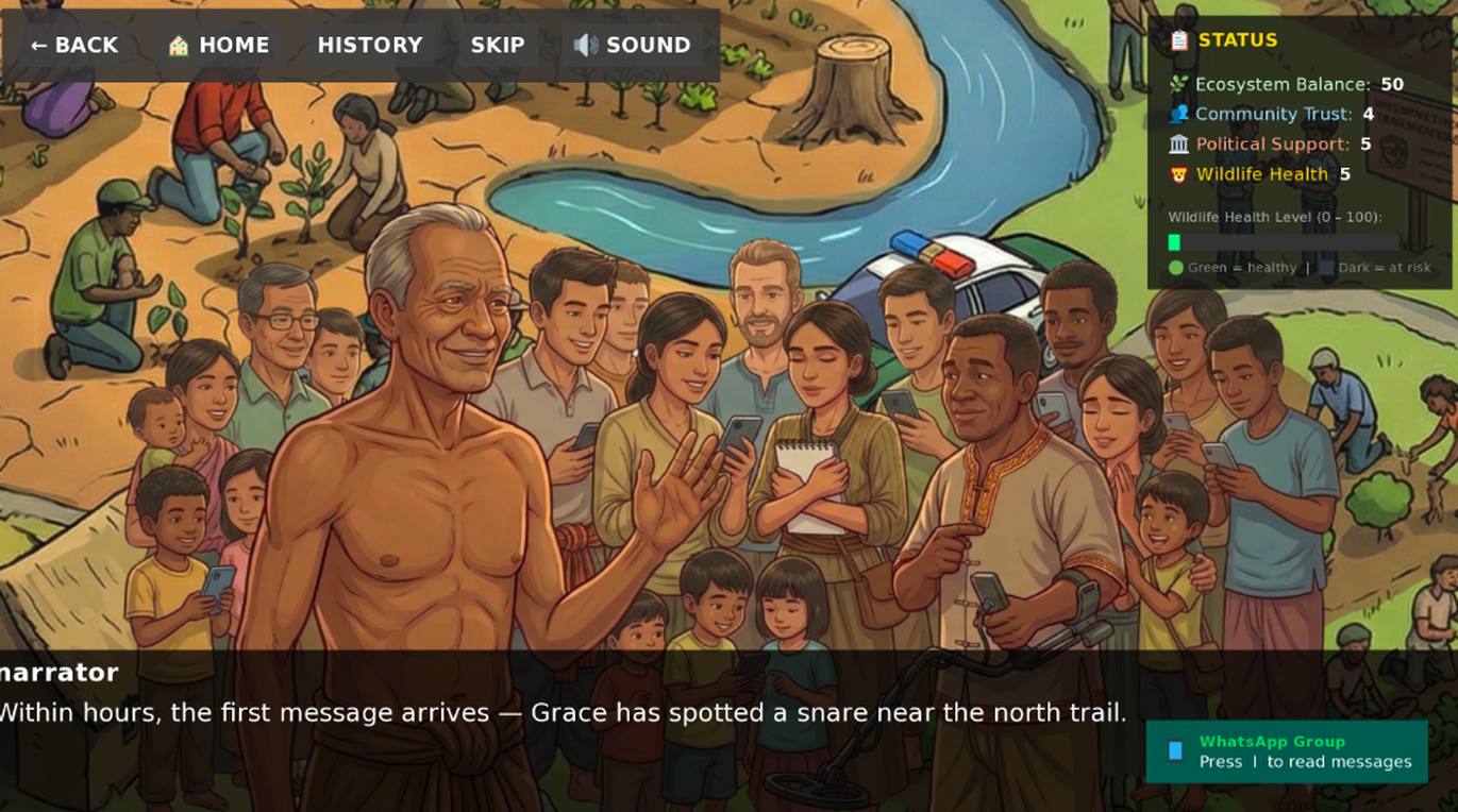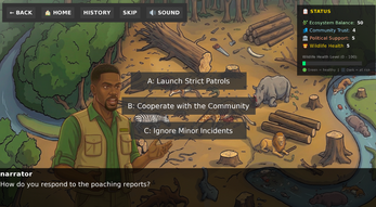 The game tracks four interconnected systems: Ecosystem Balance, Community Trust, Political Support, and Wildlife Health. None of them exists in isolation. A decision that stabilizes the ecosystem might fracture your relationship with the village. A compromise that builds trust might cost you politically.